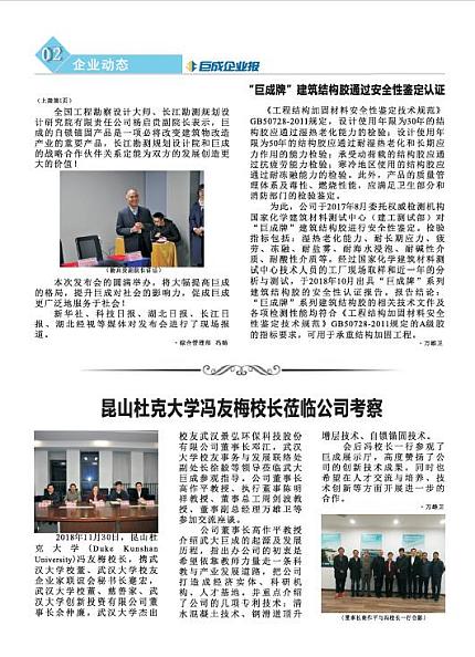 2018年11月30日,昆山杜克大学(Duke Kunshan University)冯友梅校长,携武汉大学校董、武汉大学校友企业家联谊会秘书长蹇宏,武汉大学校董、慈善家、武汉大学创新投资有限公司董事长余仲廉,武汉大学杰出校友武汉景弘环保科技股份有限公司董事长邓江,武汉大学校友事务与发展联络处副处长徐毅等领导莅临武大SG胜游参观指导。公司董事长高作平教授、执行董事陈明祥教授、董事总工周剑波教授、董事副总经理万雄卫等参加交流座谈。
