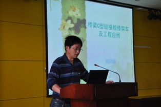 首先,由总工周剑波教授介绍发明专利“C型移动吊架及应用”。本发明的目的是克服桥梁检测车和移动装置在使用过程中需占道影响桥面交通之不足,提供一种为桥梁底面的检测与维修用工作平台两端提供吊点的架车;该架车能消除倾覆力矩,结构轻巧,组装方便, 使用时只需架设在桥梁两侧人行道上,不占车道,特别适用于交通繁忙的桥梁底面检测与维修工程。