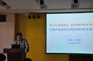 材料专家李北星教授介绍“护钢宝、预应力孔道灌浆料与高早强修补砂浆三种产品应用技术介绍及2012年度开发计划”。